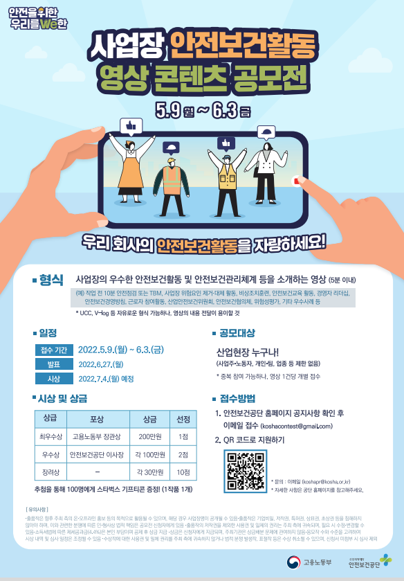 이번 공모전은 기업의 안전보건활동 우수사례를 발굴하여 확산시키기 위해 기획된 것으로, 영상물은 5분 이내의 분량으로 업종에 상관없이 산업현장 누구나 참여 가능하며 직접 촬영한 창작물만 가능하다.