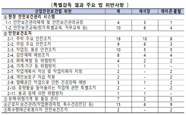 각 사업장별로 8명 이상의 감독반을 구성하여 중대재해와 직결되는핵심 위험요인 중심으로 채석장 4개, 레미콘 1개, 몰탈 2개소에 대해 5일간 산업안전보건법 준수상태 전반을 감독했다.