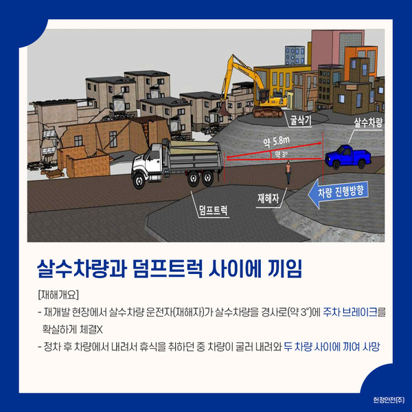 재개발 현장에서 살수차량 운전자(재해자)가 살수차량을 경사로(약 3º)에 주차브레이크를 확실하게 체결하지 않은 상태로 정차 후 내려서 휴식을 취하던 중 차가 굴러 내려와 이를 막아서려고 했으나, 살수차량 무게(2.9ton)를 이기지 못하여 앞에 정차되어 있는 25.5ton 덤프트럭 사이에 끼여 쓰러졌으며, 이를 목격한 굴삭기 운전원이 즉시 작업을 멈추고 내려와 부축하였으나 병원 이송 후 사망하였습니다.