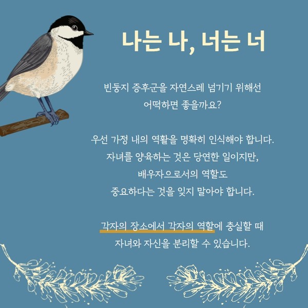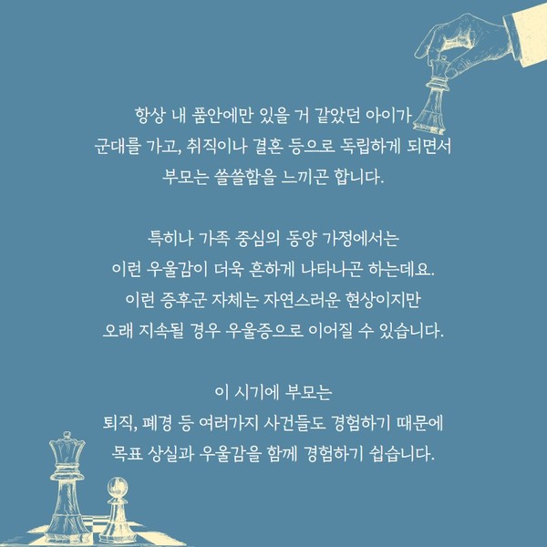 오늘은 빈둥지 증후군에 대해 알아보고, 어떻게 예방하고 대처하면 될지 살펴보는 시간을 갖고자 한다.