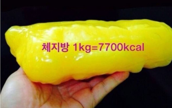 우리가 체지방 1kg을 빼기 위해 얼마나 덜 먹어야 하는지, 그리고 더 움직여야 하는지를 알기 위해서는 체지방 1kg의 열량을 알아야 한다. 흔히 지방조직은 100% 지방으로 구성되어 있다고 생각하지만 그렇지 않다. 약 86%가 지방이고, 나머지는 단백질, 무기질, 물 등으로 구성되어 있다. 지방 1g은 9kcal의 열량을 내는데, 체지방 1kg의 열량을 계산해 보면 0.86 × 1,000g × 9kcal/g = 7,740(~7,700)kcal로 계산된다.
