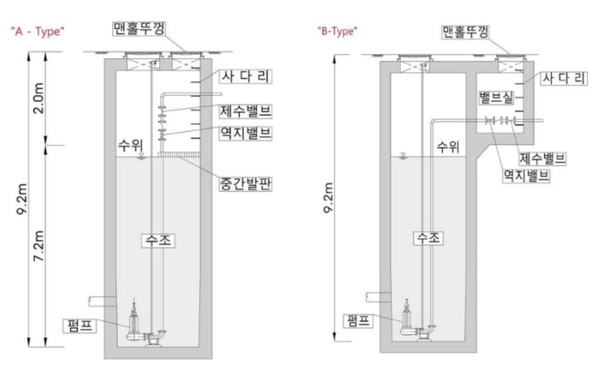 “A-Type” 맨홀펌프장의 경우 내부 직경은 1.9m, 내측 깊이는 9.2m로 구성되어 있고, 지면으로부터 지하 2.0m 지점에 중간 발판이 설치되어 있다. 중간 발판은 내부 단면적의 절반만 설치되어 있다. 유입펌프장 내부 아래쪽에는 수중펌프가 설치되어 있고, 중간 발판 위쪽 공간에는 배관과 제수밸브 및 역지밸브가 설치되어 있다.