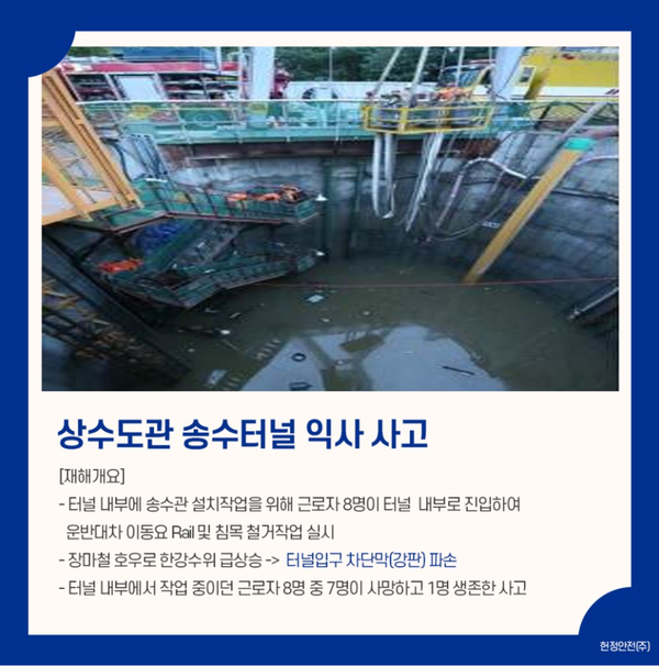 오늘은 상수도관 송수터널 익사사고의 사례를 통해 안전조치 및 대책에 대해 살펴보고자 한다.