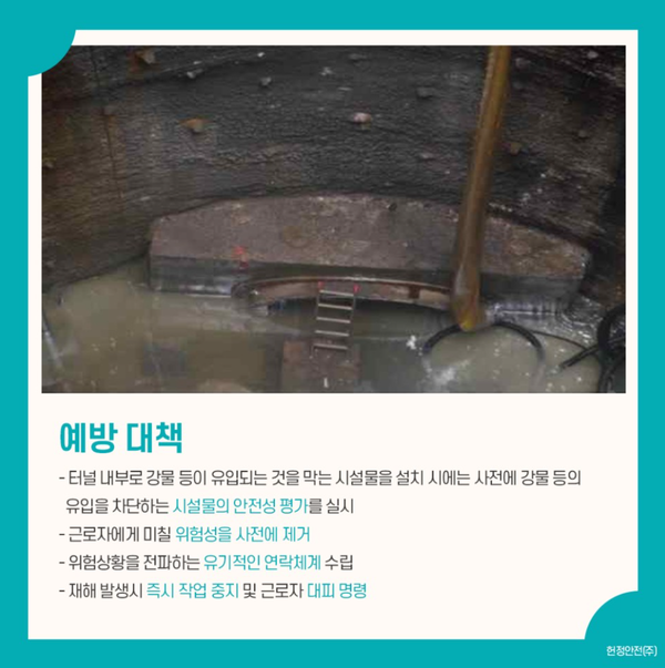 터널 내부로 강물 등이 유입되는 것을 막는 시설물을 설치 시에는 사전에 강물 등의 유입을 차단하는 시설물의 설치 위치, 시설물 형식, 구조검토 등의 안전성평가를 실시해야 한다. 또한 근로자에게 미칠 위험성을 사전에 제거해야 한다.