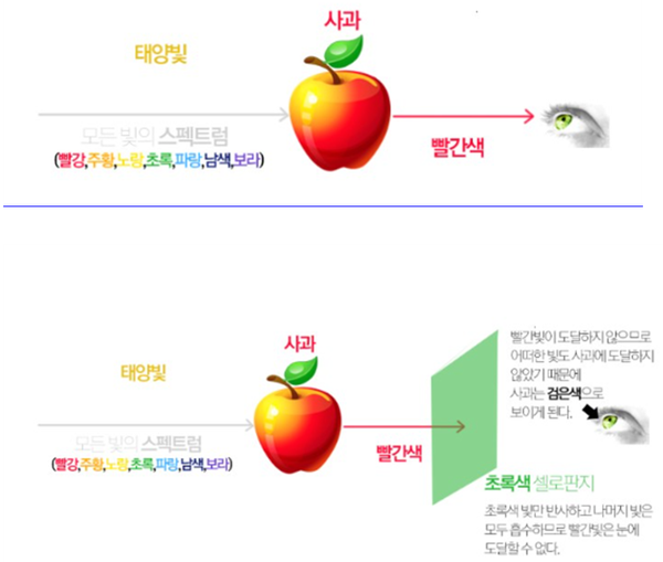 우리 눈은 파장이 가장 긴 빛을 잘 감지하며 파장이 짧아질수록 감지가 힘들다. 만약에 사과를 초록색 셀로판지로 가리고 사과를 본다면 사과는 무슨 색일까. 초록색 셀로판지가 초록색으로 보이는 이유는 초록색을 제외하고는 모두 흡수해 버리기 때문이다. 따라서 사과가 발산하는 빨간색은 셀로판지에 흡수되어 까만색으로 보이게 된다. 겨울에 내리는 눈이 흰색으로 보이는 이유도 이와 같다. 눈은 모든 빛을 흡수하지 않고 반사시키기 때문에 우리 눈에는 흰색으로 보이게 된다.