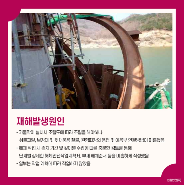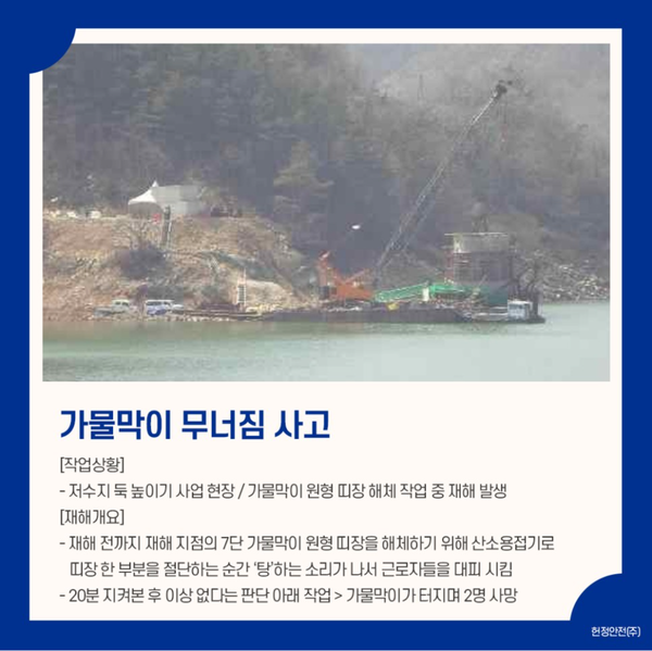 이번에 소개할 사례는 저수지 둑 높이기 현장에서 가물막이 무너지면서 발생한 사고이다. 재해당시 공정율은 65%로써 취수탑 가물막이 해체작업이 진행되었으며, 재해는 가물막이 원형 띠장 해체 작업 중 발생했다.