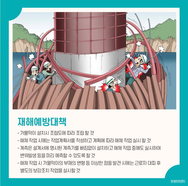 재해 예방을 위해 가물막이 설치 시에는 조립도에 따라 조립을 해야한다. 또한 해체 작업 시에는 상세한 해체 작업계획서를 작성하고, 계획에 따라 해체 작업을 실시해야 한다.
