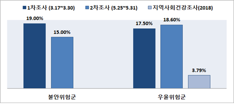 실제로 한국트라우마스트레스 학회가 코로나 19 확산 이후 두 차례에 걸쳐 온라인상에서 실시한 국민정신건강 실태조사 결과에 따르면 전체의 약 20%가 점수상 관심이 필요한 불안, 우울 고위험군으로 나타났다.