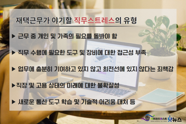 또한 사회적 거리두기가 2~2.5 단계로 격상되면서 각 기업의 재택근무 전환 비율이 높아지는 가운데 미국의 질병관리본부(CDC)는 재택근무가 야기할 직무스트레스의 유형에 대해 다음과 같이 정리해 놓았다.