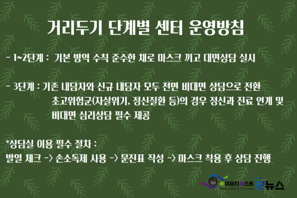 기업들의 근로자 지원 프로그램(EAP)을 전문으로 돕고 있는 한 기업에서는 거리두기 단계별 센터 운영방침을 아래와 같이 수립하여 자사의 각 지역의 사내/사외 상담센터에 적용하며 운영하고 있다.