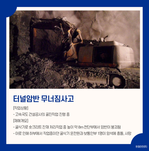 숏크리트 타설 완료 후 잔재 처리를 위해 굴착기를 이용하여 숏트리트 잔재 처리작업을 실시했다. 작업중 오후 11시 30분경 높이 약 8M 천단부에서 암반이 붕락되면서 하부에서 작업중이던 굴착기 운전원과 보통 인부 1명이 붕락된 암석에 충돌하면서 사망사고가 발생했다.