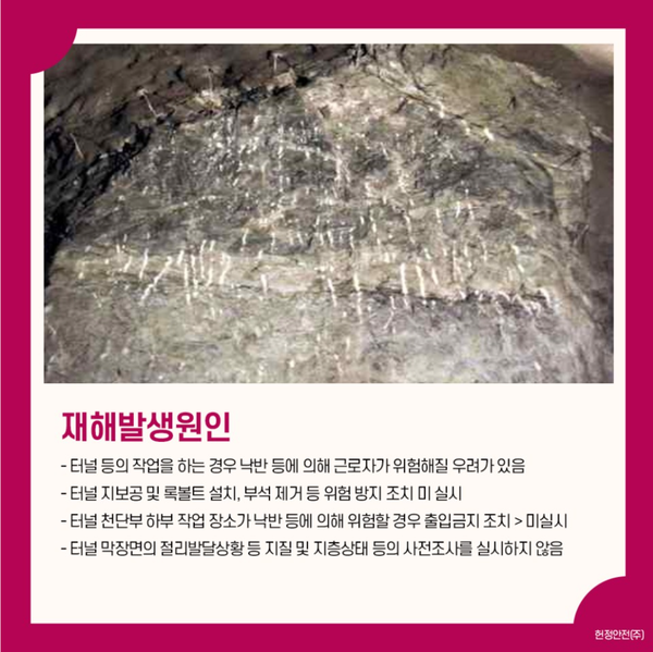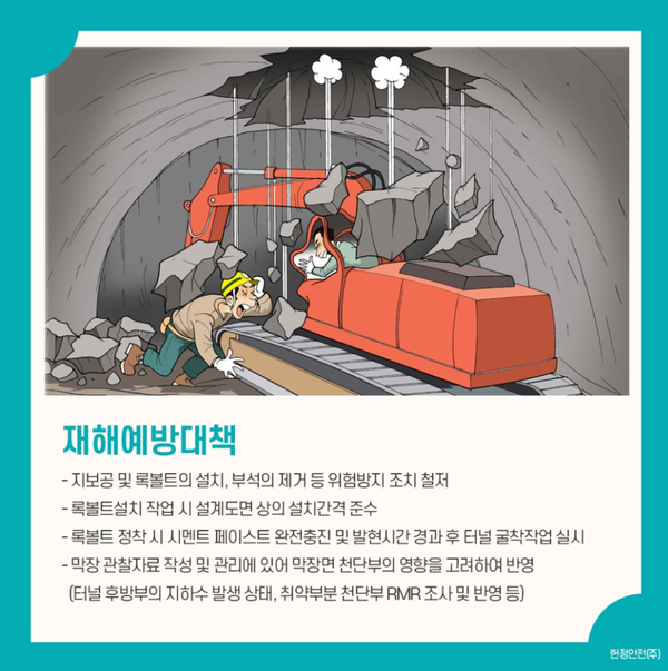 재해발생원인으로는 터널 등의 작업을 하는 경우 낙반 등에 의해 근로자가 위험해질 우려가 있는 경우에는 터널 지보공 및 록볼트 설치, 부석의 제거 등 위험을 방지하기 위해 필요한 조치를 하여야 하나, 방지조치를 하지 않았던 것으로 밝혀졌다.