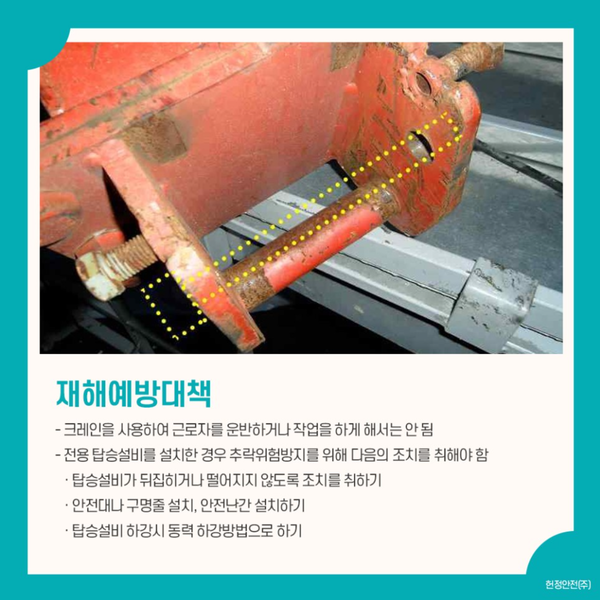 재발 방지를 위해 크레인을 사용하여 근로자를 운반 하거나 달아 올린 상태에서 작업을 해서는 안된다. 또한 전용 탑승설비를 설치하고 추락위험 방지를 위해 ▲ 탑승설비가 뒤집히거나 떨어지지 않도록 조치해야 하며, ▲ 안전대나 구명줄을 설치하고, 안전난간을 설치할 수 있는 구조인 경우에는 안전난간을 설치해야 한다. ▲탑승설비를 하강시킬 때에는 동력 하강방법으로 하강시켜야 한다.