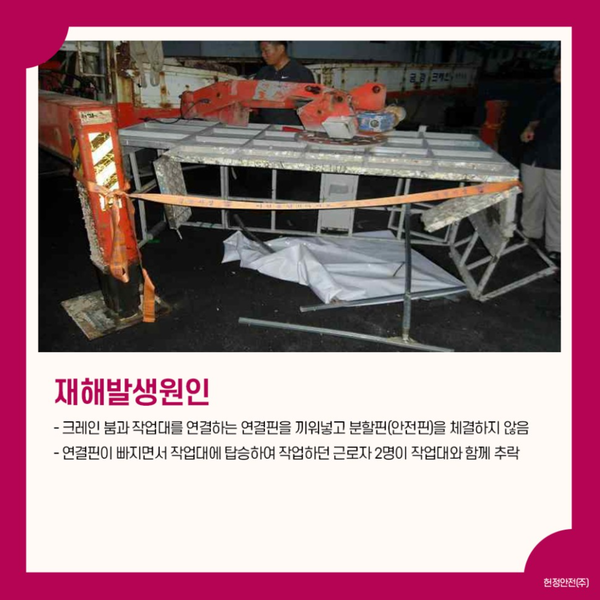 크레인에 근로자를 탑승시켜 작업할 경우에는 추락위험을 방지하기 위해 탑승설비가 뒤집히거나 추락하지 않도록 필요한 조치를 하여야 하나, 조사결과 크레인 붐과 작업대를 연결하는 연결핀을 끼워 넣고 분할핀(안전핀)을 체결하지 않은 상태로 작업했던 사실이 밝혀졌다.