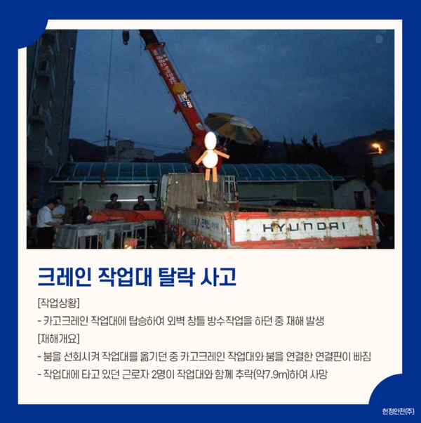 사고는 카고 크레인을 가동에서 나동쪽으로 붐을 선회시켜 옮기던 중 작업대와 붐을 연결한 연결핀이 빠지면서 근로자 2명이 함께 약 7.9m 아래로 추락하여 사망했고, 운전석에서 카고 크레인을 조작하던 운전원 1명이 떨어지는 작업대에 맞아 부상을 입었다.
