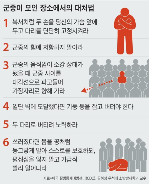 한편, 이번 압사사고와 관련해 군중이 모인 장소에서 압사사고를 피하기 위한 개인 대처법에 대해서도 함께 소개가 되고 있다. 해당 대처법에는 만약 군중속에끼여 있는 상황이 발생한다면 먼저 두손을 가슴앞에 두고 호흡할 수 있는 공간을 확보한 후, 대각선으로 파고들어 가장자리쪽으로 이동해 붙잡을 수 있는 것을 잡고 버티라고 안내하고 있다.
