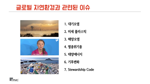 첫 번째 글로벌 자연환경과 관련된 이슈로는 대기오염, 미세플라스틱, 해양오염, 태양에너지, 기후변화 그리고 스튜어드 십 코드 등 다양한 환경이슈가 있습니다.