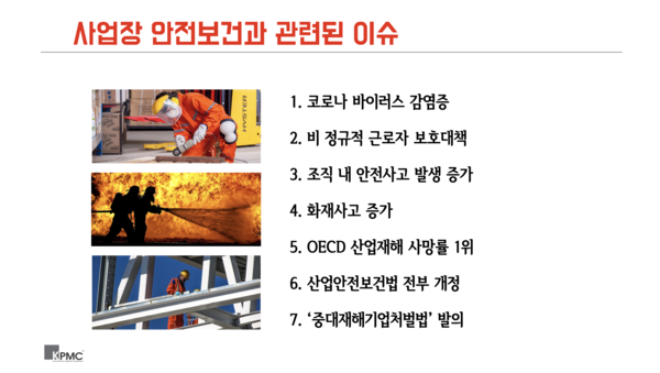 환경 이슈에 이어 사업장 안전보건과 관련된 이슈에서는 전 세계를 뒤흔든 바이러스 감염증과 함께, 산업안전보건법 전부 개정 그리고 정의당 1호 법안으로 발의된 중대재해 기업 처벌법 등에 대하여 알아보겠습니다.