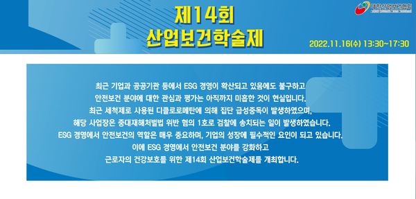 금번 진행된 산업보건학술제는 비대면으로 온라인을 통해 진행됐으며, 최근 ESG 경영이 사회전반에 이슈가 되고 있음에도 불구하고 그 안에 속해 있는 안전보건 분야에 대한 관심과 평가는 미흡하다는 지적에 ESG 경영에서 안전보건 분야를 강화하고 근로자의 건강보호를 위한 목적으로 기획됐다.
