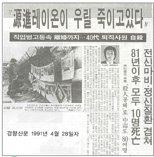 1987년 원진레이온에서 이황화탄소에 중독되어 직원들이 사망하기 시작했다. 공식적으로 알려진 사망자만 10명이고 고통을 못이겨 자살한 사람이 부지기수요, 이황화탄소 중독으로 인해 장애판정을 받은 사람도 1000명을 넘었다.
