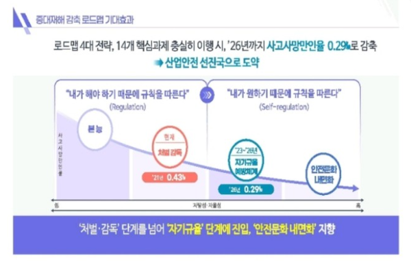 이를 위해 정부는 수동적·타율적 규제인 현재의 '처벌·감독' 단계를 넘어 '자기규율 예방체계' 방식으로 '안전문화 내면화 단계'를 지향하고, 2026년까지 사고사망만인율 0.29%로 감축하여 산업안전 선진국으로 도약한다는 계획이다.
