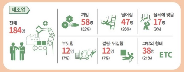 안전보건공단이 공개한 통계자료에 따르면 2021년 산업재해의 경우 제조업에서 전체 사고사망자 184명 중 끼임 사고가 58명으로 32%를 차지하며 가장 많은 사고사망자가 발생했다.