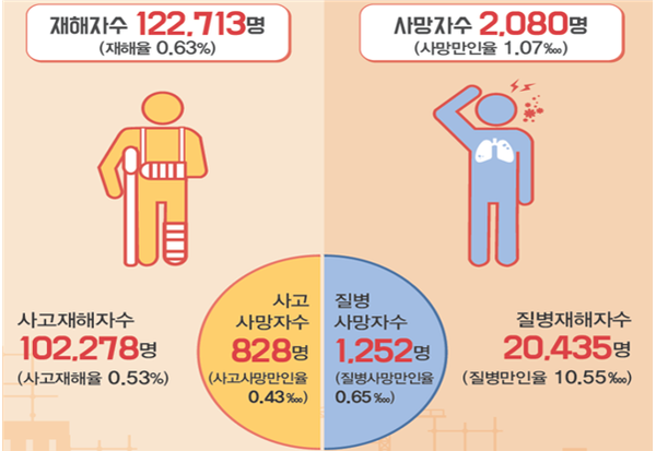 고용노동부 통계에 따르면 2021년 한 해 동안 발생한 사망자수는 2080명이었고 사망만인율은 1.07‱이었다. 2022년 11월 30일에 이정식 고용노동부장관은 2021년 국내 사고사망자는 828명이고 사망만인율은 0.43‱ 라고 했지만, 이는 사고성 사망자만 집계한 것이다. 질병사망자를 포함할 경우, 사망자는 2080명, 사망만인율은 1.07‱로 급증한다.