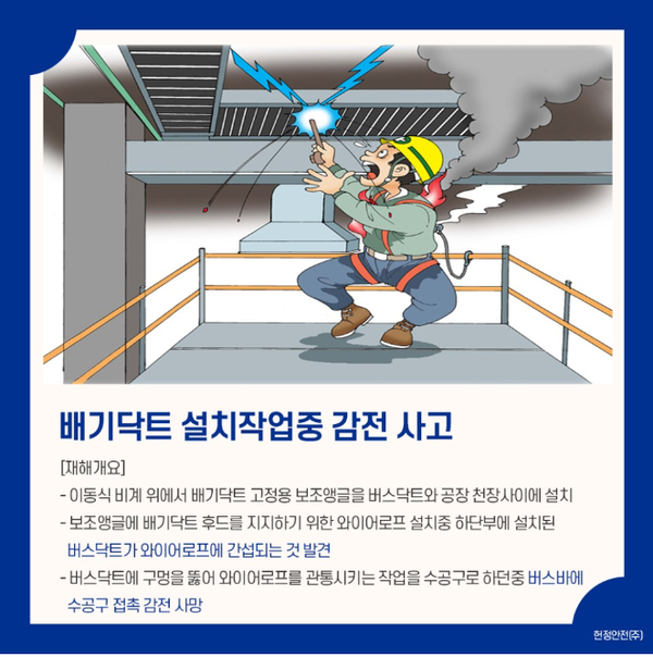 오늘은 배기덕트 설치작업 중 발생한 감전사고에 대해서 알아보고 안전수칙 및 재발방지를 위한 대책을 알아보고자 한다.