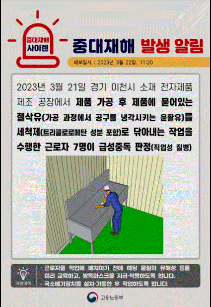[세이프티퍼스트닷뉴스] 지난달 21일 경기 이천시 소재 전자제품 제조 공장에서 제품 가공 후 제품에 묻어있는 절삭유(가공 과정에서 공구를 냉각시키는 윤활유)를 세척제(트리클로로메탄 성분 포함)로 닦아내는 작업을 수행한 근로자 7명이 급성중독(작업성 질병) 판정을 받았다.
