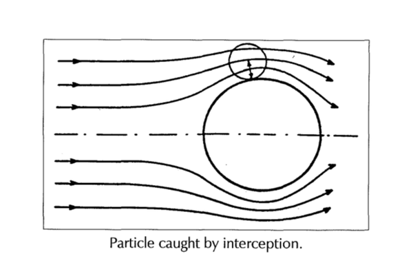 만약, 입자의 크기가 크다면 Stream Line을 따르지 않고 공기 유동속에서 관성에 의해 움직이던 경로 그대로 직진하려는 경향이 생긴다. 그래서 필터섬유와 입자가 충돌하게 되고 이후에는 Van Del Waals 힘에 의해 그 자리에 고정다.