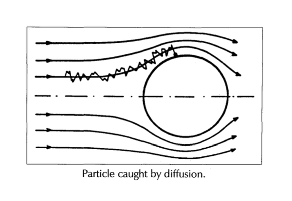 입자가 서브마이크론 단위가 되면 공기중에서 브라운 확산운동이 일어난다. 따라서 작은 입자는 공기 유동 속에서 단순히 Stream Line만 따라가는 것이 아니라 지그재그로 불규칙 운동이 수반된다. 이 불규칙 운동에 의해 필터섬유에 작은 입자가 충돌하게 되고 이후에는 Van Del Waals 힘에 의해 고정된다.
