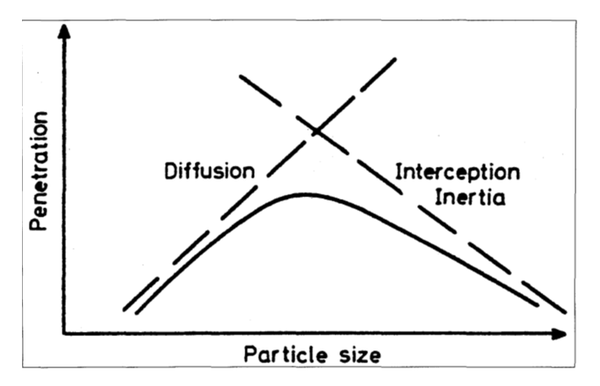 결론적으로 입자 크기별로 작은입자는 확산(Difussion)이 우세하고 큰 입자에서는 관성충돌(Inertial Force) 그리고 중간입자에서는 Interception이 우세하다. 그 관계를 그래프로 나타내 보면, 아래와 같이 아주 크지도 않고 작지도 않은 필터를 잘 통과하는 여과하기 힘든 입자크기가 존재한다.