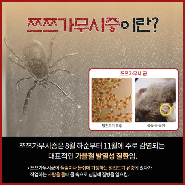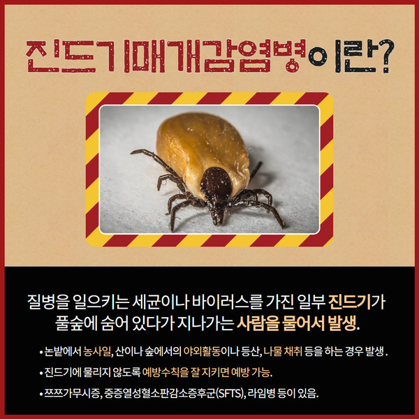 가을이 되면 산으로 들로 나들이를 많이 다닙니다. 또한 추석을 앞두고 벌초도 많이 합니다. 이때 주의하셔야 할것이 진드기매개감염병입니다. 한번쯤은 들어봤을 이름 쯔쯔가무시증이 대표적입니다. 오늘은 진드기에 물리지 않는 예방법을 알아봅니다.