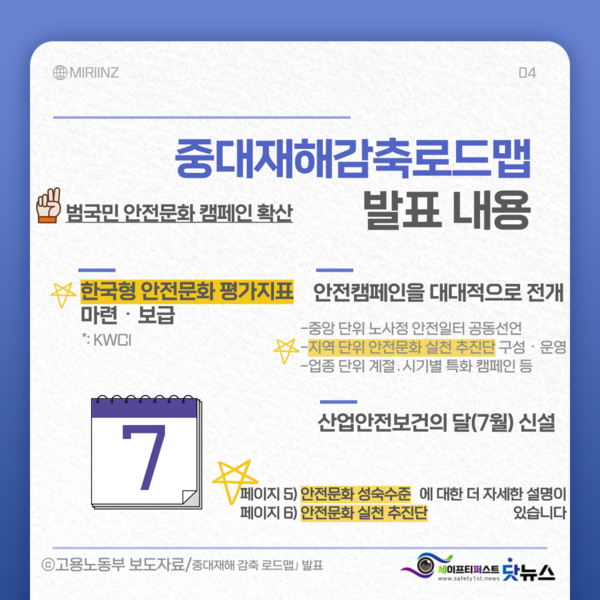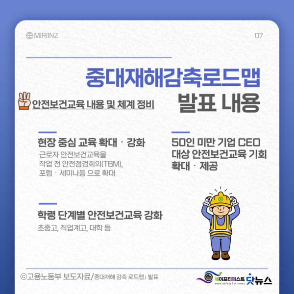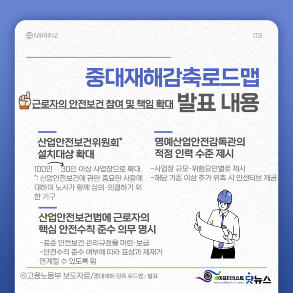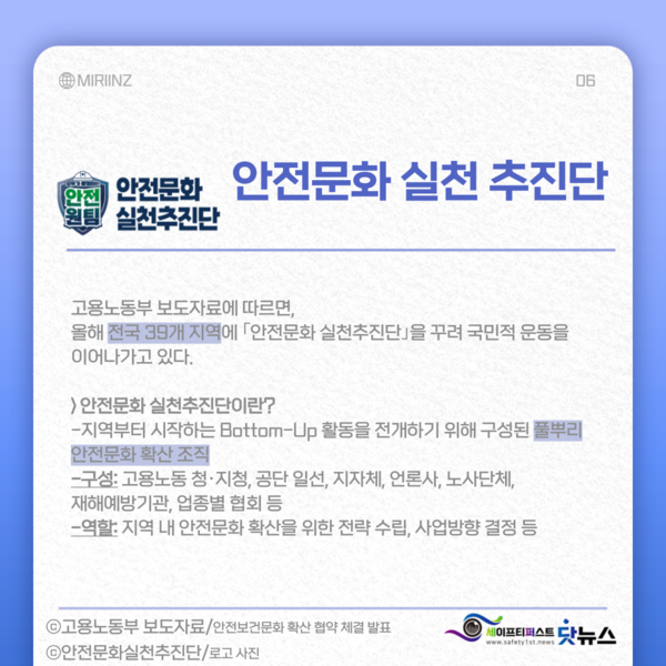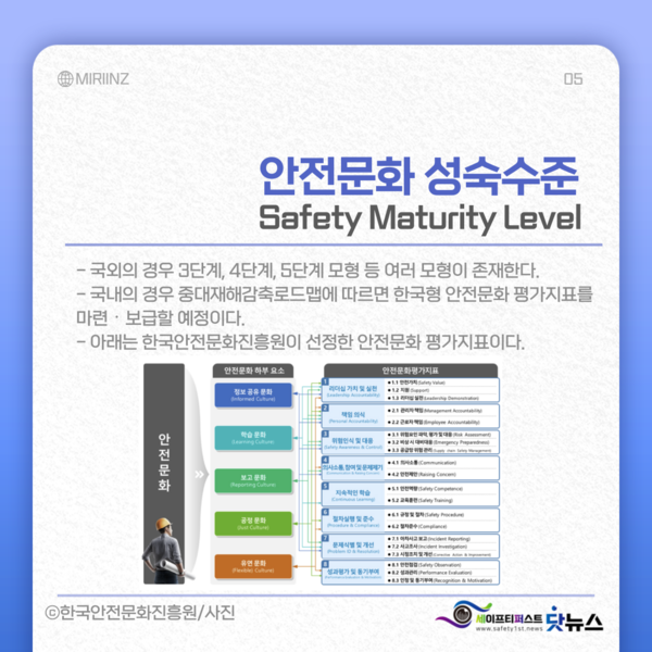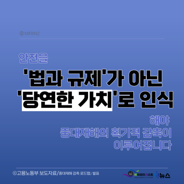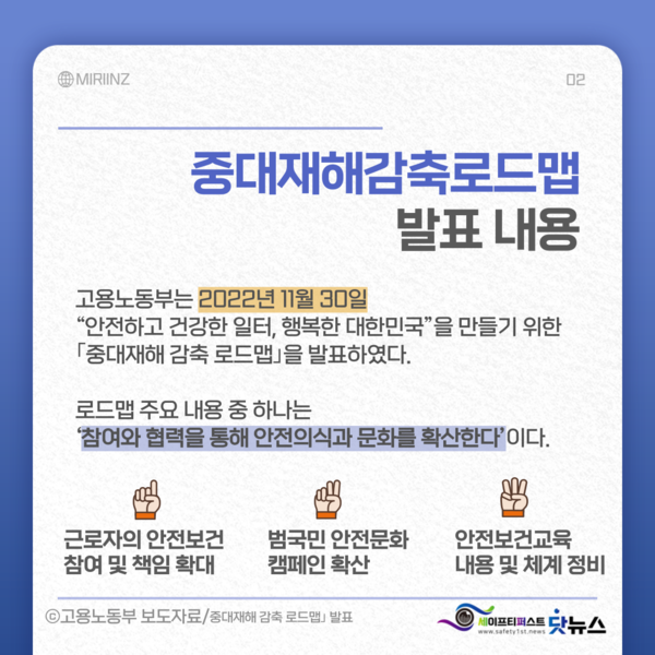 [세이프티퍼스트닷뉴스] 고용노동부가 발표한 「중대재해 감축 로드맵」의 주요 내용 중 하나인 '안전보건문화'에 대해, 본지에서는 주요 내용을 정리하여 카드 뉴스 형식으로 소개하고자 한다.