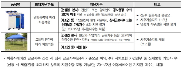 중기법 상 '소기업 규모 기준' 이하 기업은 지원 가능하며, ▲작업환경측정결과상 고열작업공정 보유하고 있는 제조업, ▲산재보험업종으로 택배업(50110), 창고업 (50006)으로 등록된 운수·창고업이 지원되고, ▲도·소매업(91001)로 등록되어 다수의 카트 및 주차장을 보유하고 카트관리 또는 주차보조원이 상시 근무하고 있는 사업장에 한정되어 지원되, 실내설치시엔 지원이 불가하다.