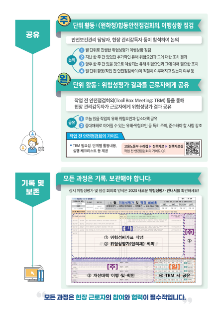 세부적인 내용은 매월 유해·위험요인을 파악하여 대책을 마련하고, 매주 원·하청 합동안전점검의 개최와 이행상황을 점검하며, 매일 위험성평가 결과를 작업전 안전점검회의(TBM:Tool Box Meeting)등을 통해서 근로자에게 공유하는 절차를 이행하면 정기평가와 수시평가를 한 것으로 인정된다는 것이다.