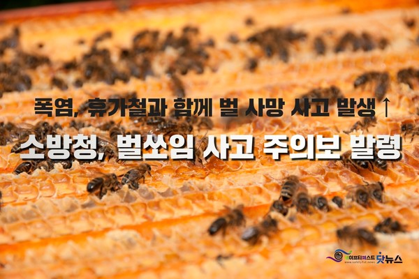 [세이프티퍼스트닷뉴스] 소방청은 7월 넷 째주 들어 벌쏘임 사고가 급격히 증가함에 따라 지난달 31일 오전 9시를 기해 '벌 쏘임 사고 주의보’를 발령했다. 휴가철을 맞아 야외활동시 벌쏘임에 대한 각별한 주의가 당부되고 있다.