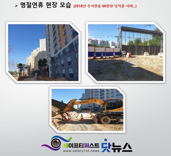 A: 연휴라서 특별히 보는건 휀스(공사장 경계벽) 주변 탑차등의 화물차량이 주차되어있는가 여부, 그걸 밟고 담을 넘어서는 절도범들도 있거든요. 그럴 경우 이동주차를 정중히 요청드리죠. 그리고 주변 접근하는 시민분들 여러목적으로 오시는분들이 계세요. 본인의 집이 잘올라가고 있는가, 혹은 일자리는 없는가 또는 단순한 호기심 등등 그런 분들이 접근할 때 안전사고가 발생할 수 있으니 긴장을 하게되죠.