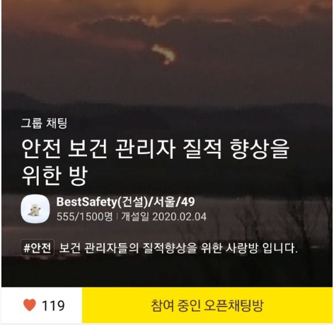 그 중에서 대다수의 젊은 안전관리자들이 활용하고 있는 SNS 정보공유의 장 중에서 '카카오톡 오픈채팅방'에서 건설안전관리자들이 많이 가입되어 있는 두개 채팅방의 운영진을 소개하는 시간을 갖고자 합니다.