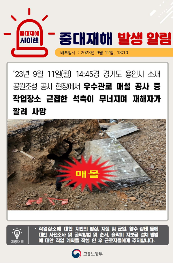 경찰과 고용부 등에 따르면 이날 사고는 우수관로 공사중 TS판넬 미설치 구간 측면 옹벽이 붕괴되면서 하부 작업중이던 50대 근로자 A씨가 공사 구조물에 머리를 부딪혀 크게 다친 상태에서 하체가 토사에 매몰됐다.