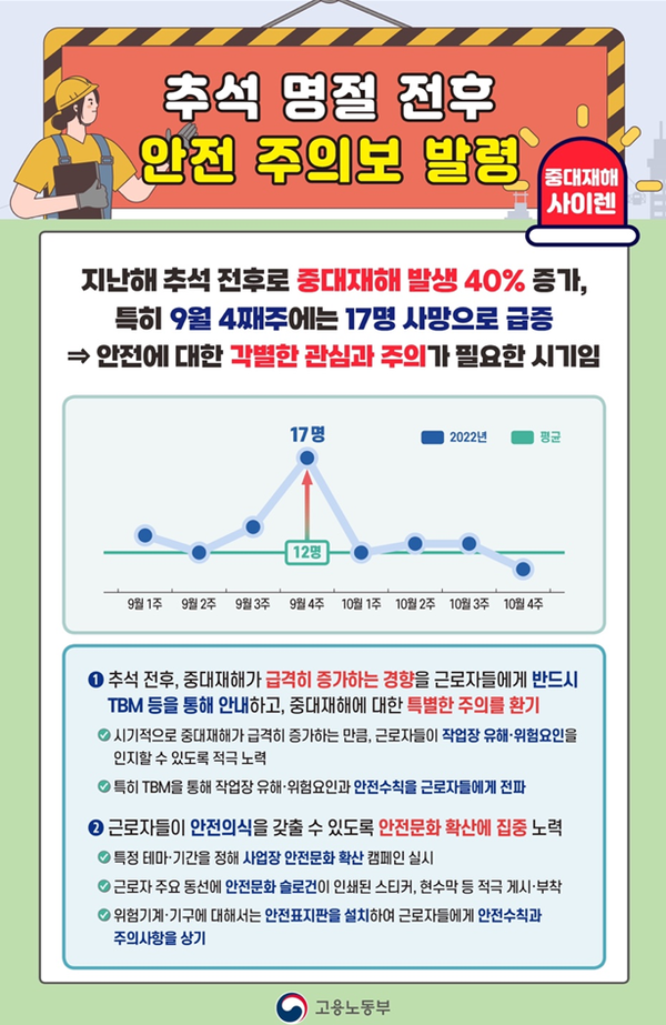 추석 연휴 전‧후에는 급한 마무리 작업, 기계‧장비의 가동중지 또는 재가동, 관리감독자 또는 안전관리자의 휴가 등으로 인해 사고 및 부상 발생 위험성이 높아 사고 예방을 위한 집중관리가 필요하다. 실제 최근 3년간(’20~’22년) 추석 전후 10일간 건설·제조·물류업 50인 미만 사업장에서 발생한 중대재해 건수가 평소보다 20% 많은 것으로 나타났다.