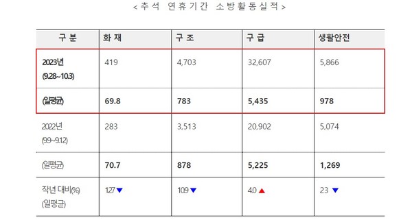 [세이프티퍼스트닷뉴스 ] 소방청(청장 남화영)은 추석 연휴 기간이었던 지난달 28일부터 이달 3일까지 기간 중 화재․구조 등 1일 평균 소방활동 건수가 지난해 추석연휴(‘22.9.9~9.12) 대비 감소했다고 밝혔다.