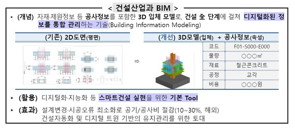BIM은 공사정보를 포함한 3D 입체 모델로, 모든 단계에 걸쳐 디지털화된 정보를 통합관리하는 기술(Building Information Modeling)이다. 또한 BIM 환경에서 사용할 수 있도록 한 라이브러리는 컴퓨터 프로그램이 공통·반복적으로 사용하는 정보 집합체(문서, 데이터 등)로 구축됐다.