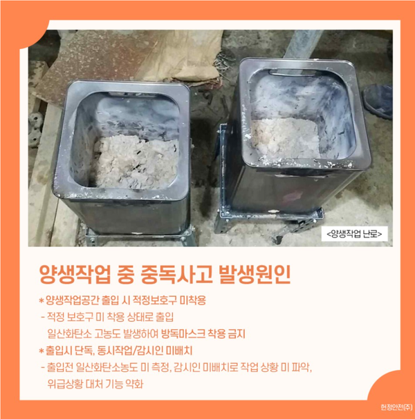 또한, 출입전 일산화탄소농도를 측정하지 않거나 감시인이 배치되지 않아 작업상황이 제대로 파악되지 않아 위급한 상황에 대처하기 어려워지기도 한다.