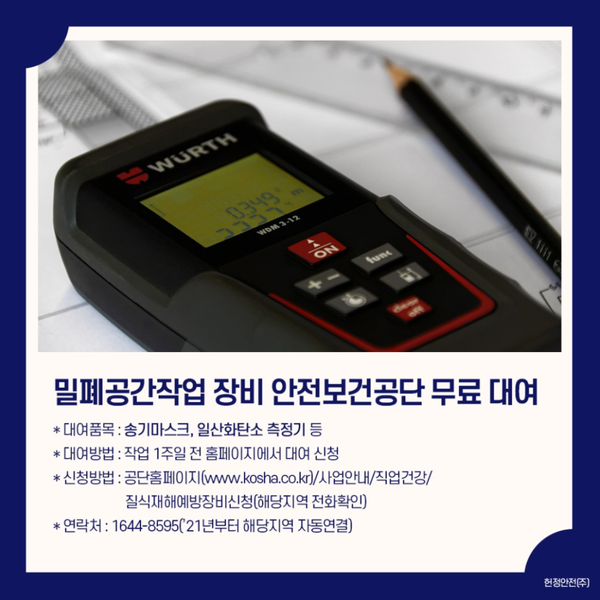 안전보건공단에서는 송기마스크, 일산화탄소 측정기 등 밀폐공간작업 장비를 무료로 대여하고 있는데, 작업 1주일 전 공단 홈페이지에서 신청이 가능하다.