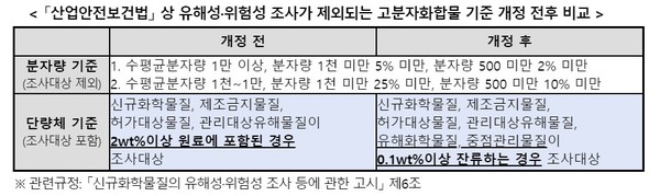이는 환경부의 신규화학물질 등록 대상 고분자화합물의 단량체 함량 기준과 일치시킨 것으로, 그간 서로 다른 기준으로 인해 발생했던 산업현장의 혼란도 해소될 것으로 기대된다.