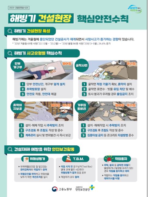 핵심안전수칙으로는 해빙기 건설현장 특성, 해빙기 사고유형별 핵심수칙, 건설재해 예방을 위한 안전보건활동이 있다. 특히, ▲단부 개구부, ▲굴착사면, ▲흙막이 지보공, ▲거푸집 동바리 등 주요 사고 유형별 핵심사항에 대한 점검 을 강조했다.