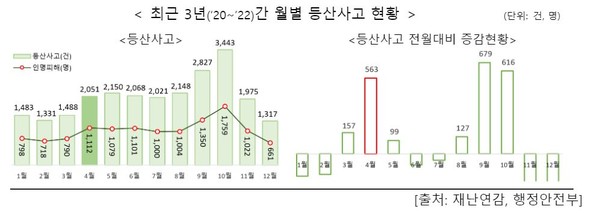 최근 3년(2020~2022)간 발생한 등산사고는 총 24,302건이며, 12,394명(사망 282명, 부상 11,978명, 실종134)의 인명피해가 발생하였다. 이 중, 4월에는 2,051건의 등산사고가 발생하였으며 산행 중 22명이 사망하고 1,090명이 다쳤다. 특히, 4월은 봄철 중 전월대비 증가한 등산사고 건수가 가장 많은 563건으로 산행 시 안전사고 예방에 각별한 주의가 필요하다.