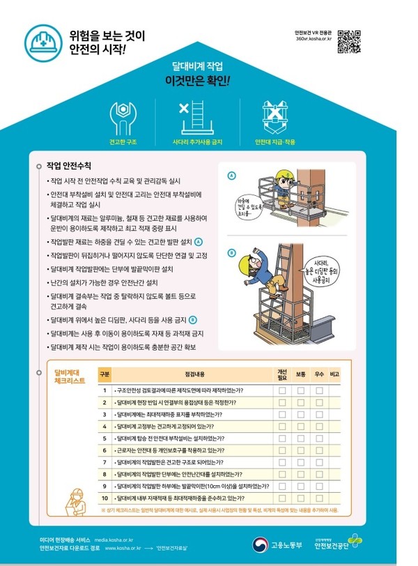 또한, 달대비계 상기 체크리스트는 일반적 달대비계에 대한 예시로, 실제 사용시 사업장의 현황 및 특성, 비계의 특성에 맞는 내용을 추가하여 사용하는 것이 좋다.