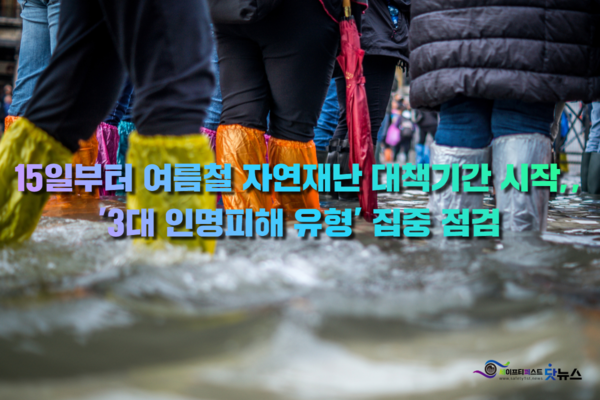 - 15일부터 '여름철 자연재난 대책기간' 시작 ,, 10년간 호우와 태풍 사망·실종 사고 중 75% 차지한 '3대(大) 인명피해 유형' 집중 점검